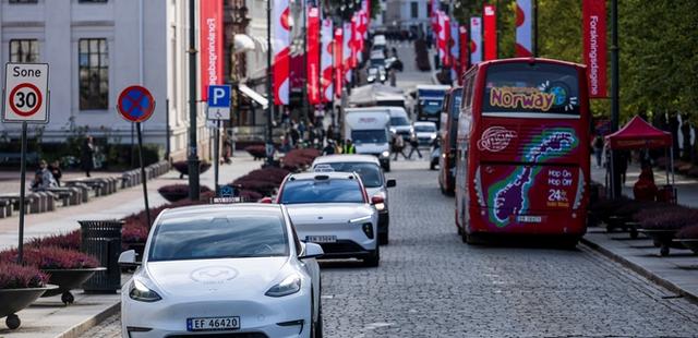 挪威奥斯陆街上行驶的几辆电动汽车