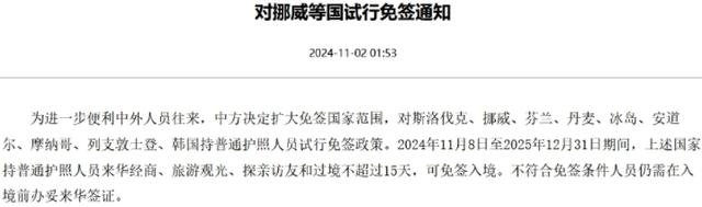 中国对挪威等国试行免签的通知